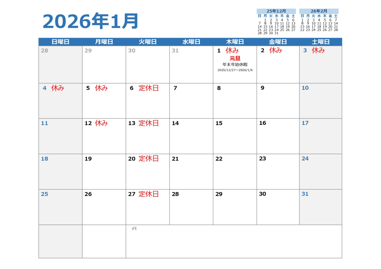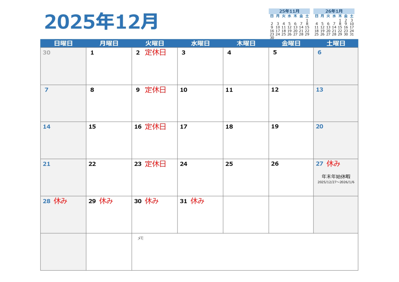 休業期間 令和7年12月27日(土)~令和8年1月6日(火)